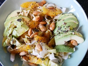 4/ Mettre le tout dans votre assiette, ajouter les graines et les amandes et assaisonner d’huile d’olive et vinaigre balsamique
