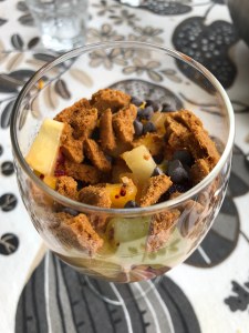 des Verrines Acidulées aux Fruits, éclats de Spéculos et pépites de Chocolat.