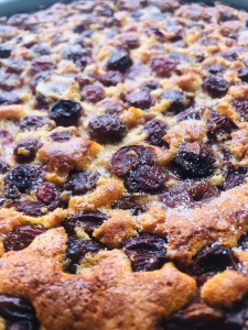 3/ Disposer vos cerises dans votre plat (avec ou sans les noyaux, c’est comme vous préférez !), ajouter la pâte par dessus