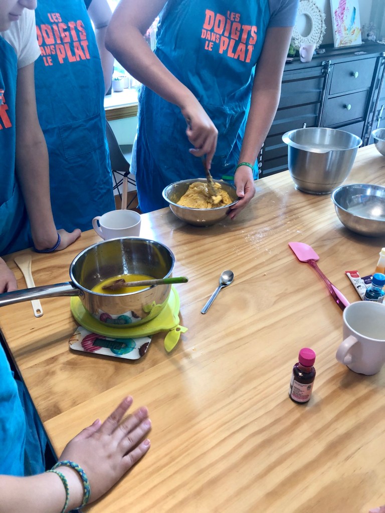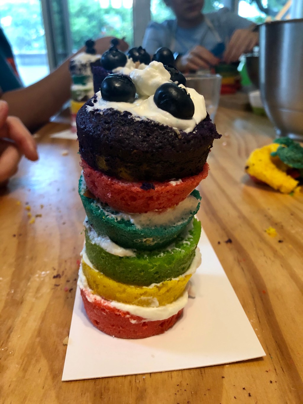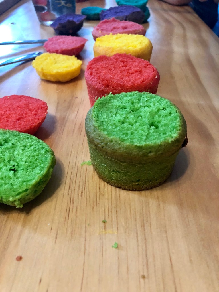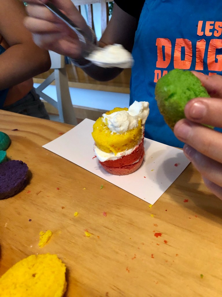 Cette fois-ci, lors de notre atelier, les enfants ont fait une version mini, mais vous pouvez utiliser la même recette pour un Rainbow Cake pour 6-8 personnes.