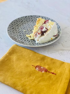 3/ Ajouter de la crème mousseline au centre de la génoise, des morceaux de framboises, puis de la chantilly citron. Soyez généreux.s.e