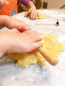 1/ Mélanger tous les ingrédients et incorporer au fur et à mesure le jus de l’orange. Vous devez obtenir une boule de pâte pas trop collante. Si elle colle trop, ajouter un peu de farine. Si elle est trop friable, ajouter un peu de jus d’orange 😉