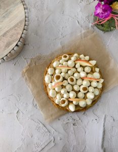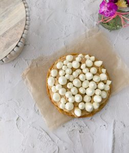 Notre Tarte fine aux pommes et caramel se compose d’une fine couche de sablé breton, de tranches fines de pommes revenues dans le caramel beurre salé, le tout décoré d’une ganache montée chocolat blanc vanille. Pour le décor, j’ai ajouté des boutons de cannelle que vous retrouverez sur le site de Sacré Français.