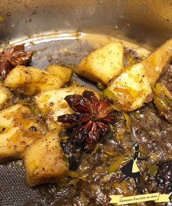 *Sirop aux épices : 300g d’eau, 100g de sucre de coco, 150g de miel et 150g de sirop d’érable ( ou 300g de miel), 2 bâtons de cannelle, 6g de mélange 4 épices, 1/2 fève de Tonka râpée, 3 badianes, 2 cardamomes, zestes d’1 citron jaune, 1 vert et une grosse orange, 70g de pommes coupées en morceaux